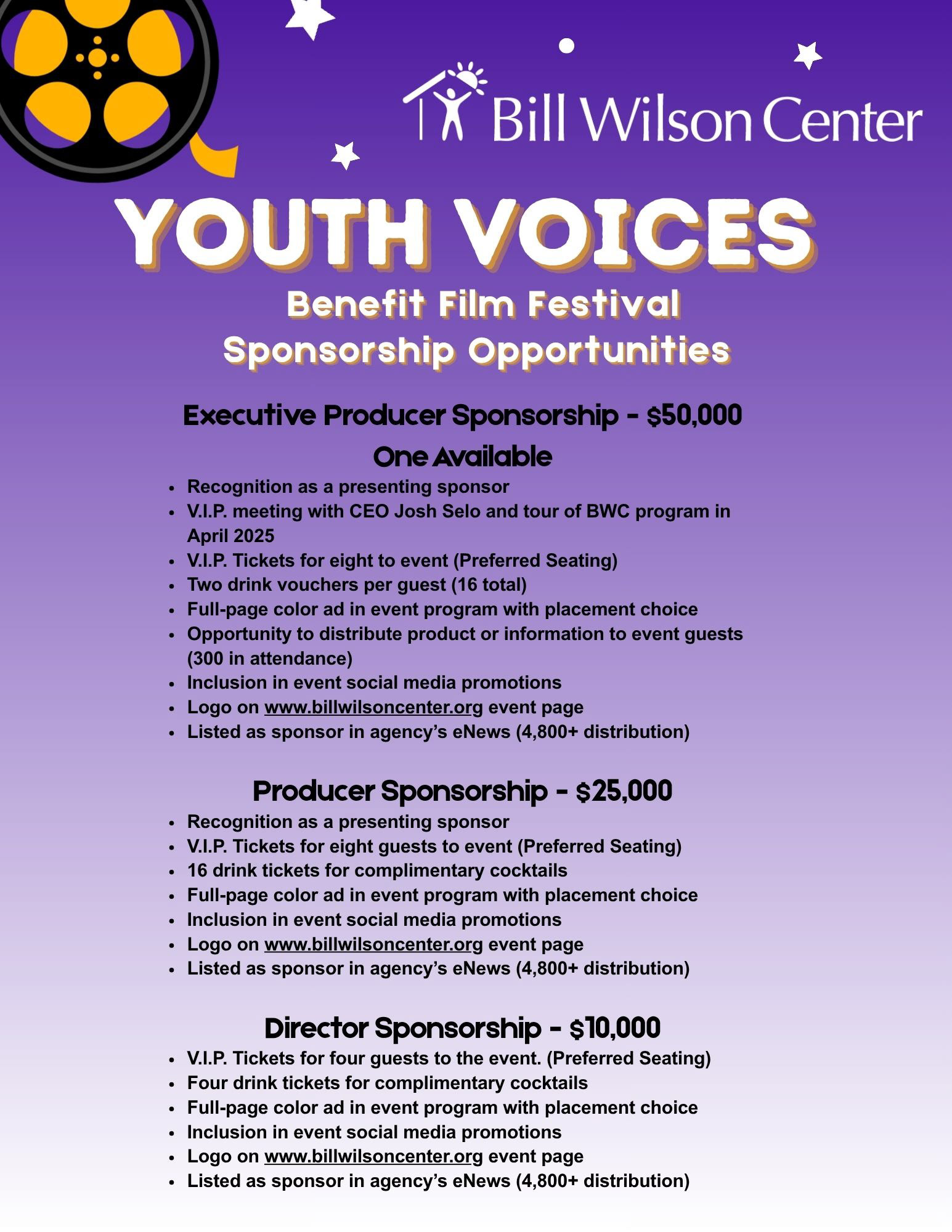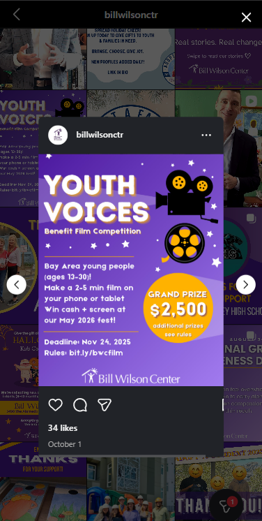 In this brand-focused initiative for Bill Wilson Center, I developed a cohesive and engaging identity for the Youth Voices Benefit Film Competition, blending strategic messaging with vibrant, youth-oriented visual design. I crafted the overarching creative direction, designing a playful, cinema-inspired aesthetic rooted in deep purples, filmic iconography, and energetic typography to evoke the excitement of a night at the movies while resonating with a younger audience.
