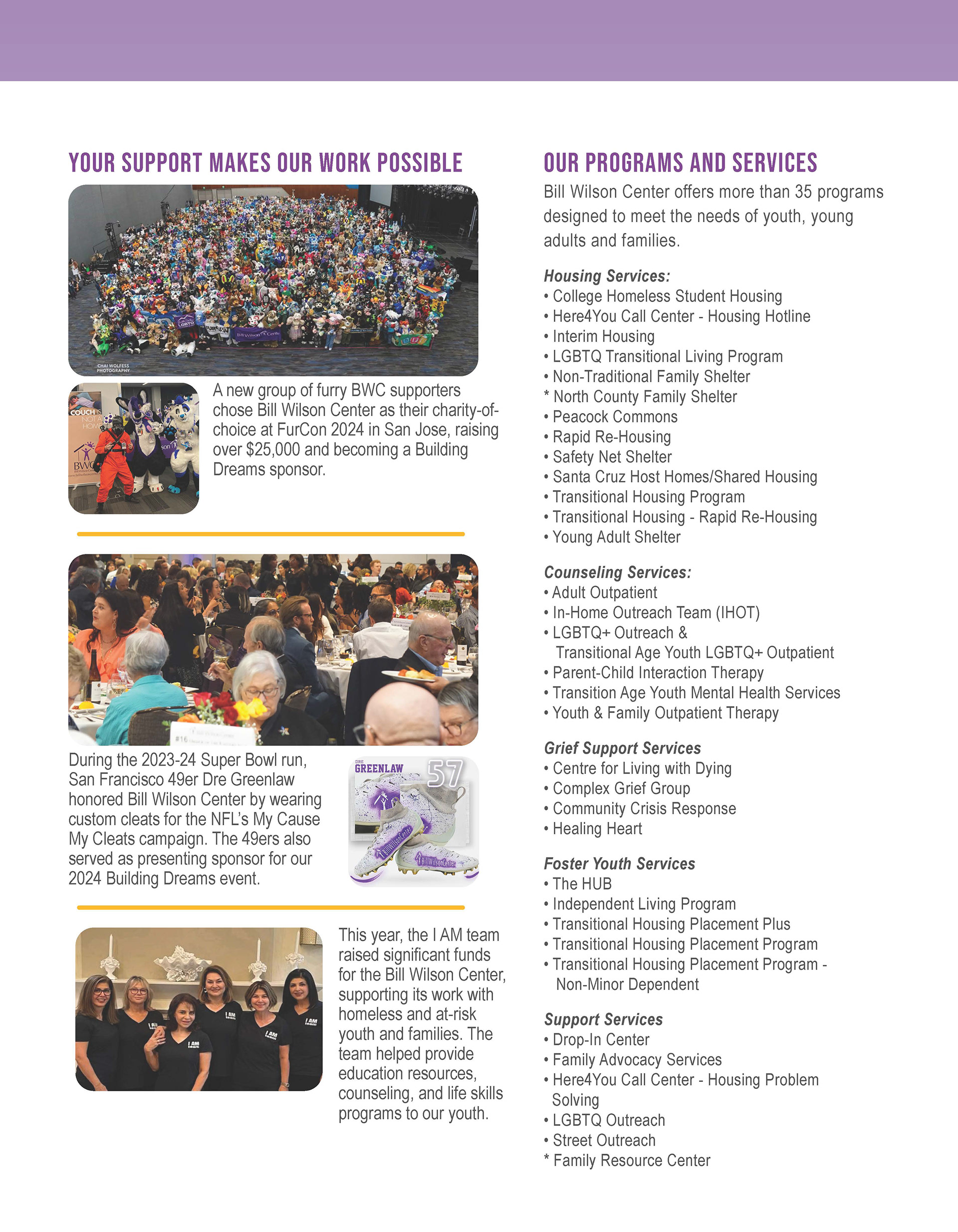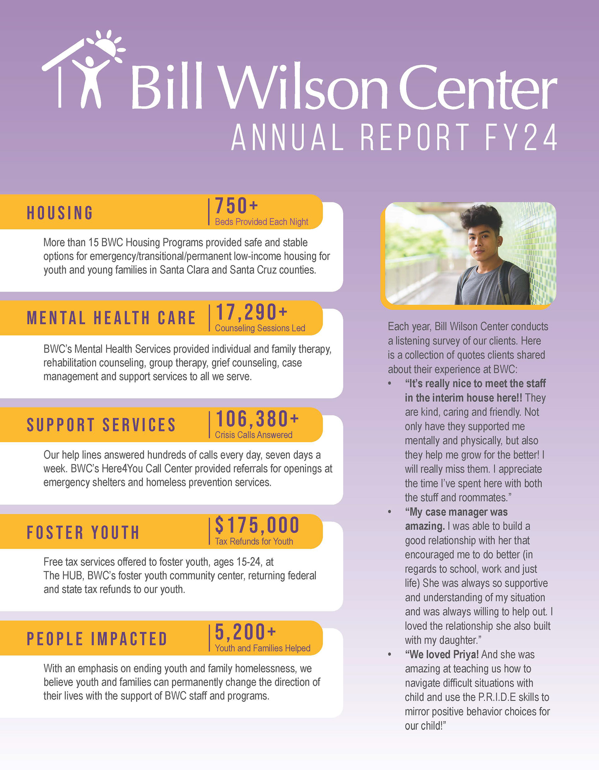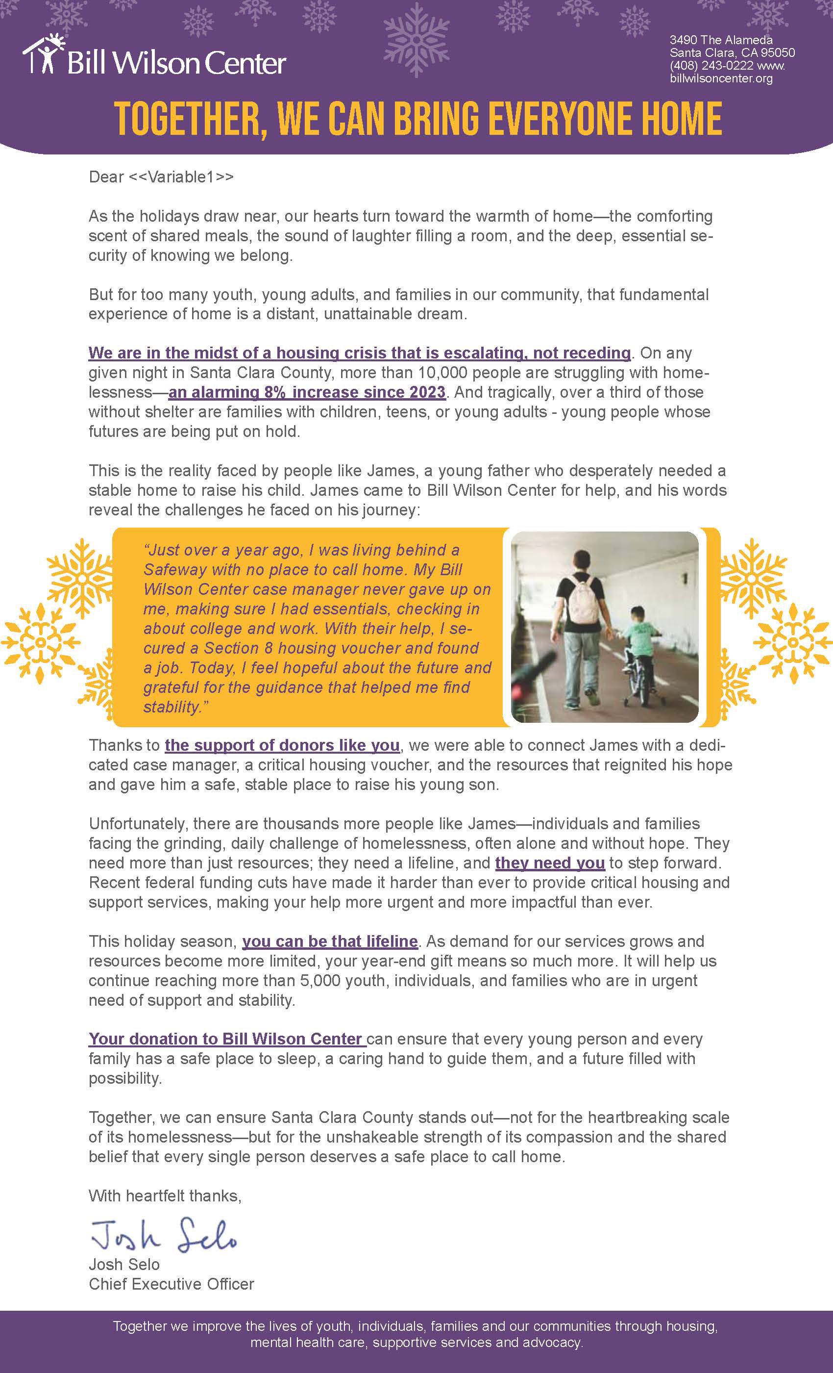 For Bill Wilson Center’s Annual Appeal, I developed a message-driven campaign designed to inspire generosity by tapping into themes of community, connection, and year-end giving. With written storytelling at the forefront, I crafted narrative-driven content that highlighted the organization’s impact while inviting stakeholders to play an active role in supporting youth and families during the holiday season.